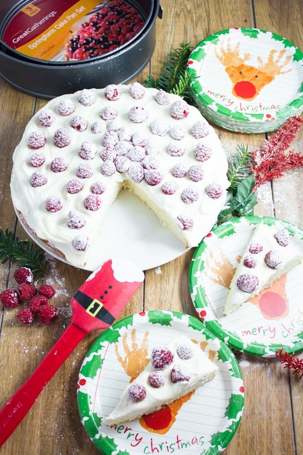 This Holiday cake with its nice thick white coating of vanilla cream, dotted with festive raspberries and a generous sprinkle of confectioner sugar on top feels close enough to a snowy white and festive Holiday!