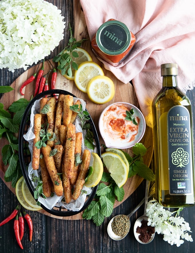 For this recipe, I have chosen to make a spicy harissa yogurt dipping sauce that pairs perfectly with these crispy halloumi fries. It’s cooling, spicy, tangy and loaded with a depth of flavor form the spice.